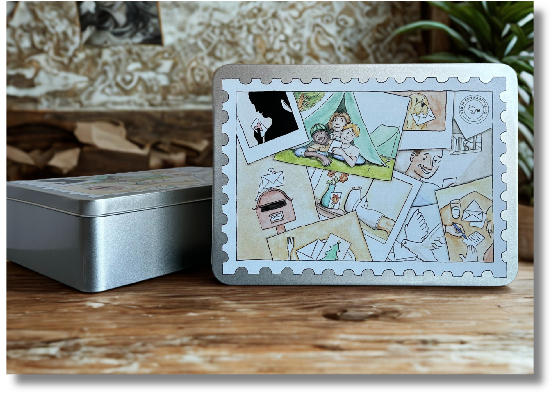 Mooie blikken doos voor wenskaarten, A5-formaat (22 cm lang, 16 cm breed, 6 cm hoog) met een prachtig ontwerp van Nathan Pelgrims.